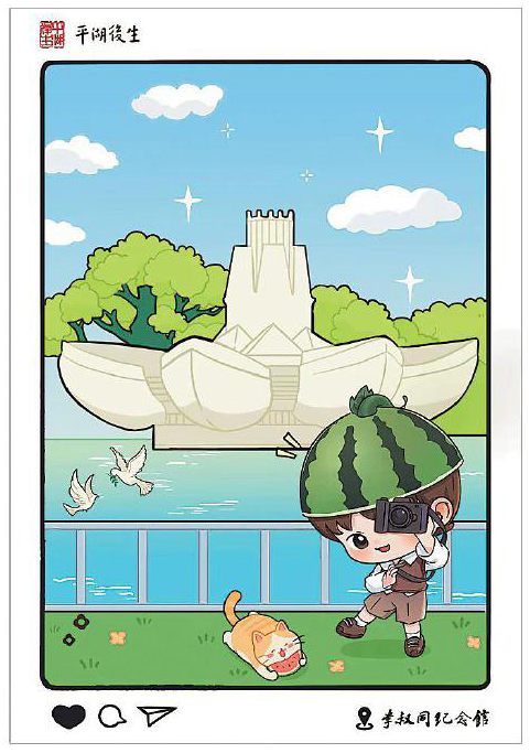 在項(xiàng)目推進(jìn)過(guò)程中,設(shè)計(jì)團(tuán)隊(duì)與平湖市委宣傳部進(jìn)行了多輪溝通,最終獲得政府層面的認(rèn)可與支持。設(shè)計(jì)構(gòu)思上,團(tuán)隊(duì)深入挖掘平湖地方文化資源,注重將城市肌理與精神符號(hào)融入方寸之間。彩戳及手繪明信片的圖案不僅選取了當(dāng)?shù)卮硇跃坝^,更著重突出了與一代文化巨擘李叔同相關(guān)的元素,如作為城市文化新地標(biāo)的東湖李叔同紀(jì)念館。該紀(jì)念館于今年5月完成升級(jí)并重新開放,成為集中展示李叔同生平與藝術(shù)成就的重要窗口,也為彩戳、手繪明信片設(shè)計(jì)提供了豐富的視覺素材和內(nèi)涵支撐。手繪明信片還融入了卡通人物形象,貓咪與戴西瓜帽的動(dòng)漫人物形象活潑俏皮,細(xì)節(jié)處滿是巧思。