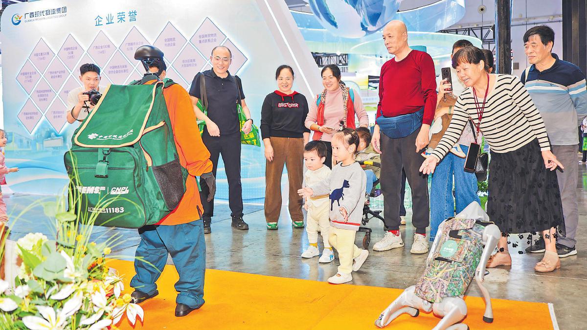 在博覽會(huì)郵政展臺(tái)前,廣西郵政推出的機(jī)器人、機(jī)器狗與觀眾友好互動(dòng)。