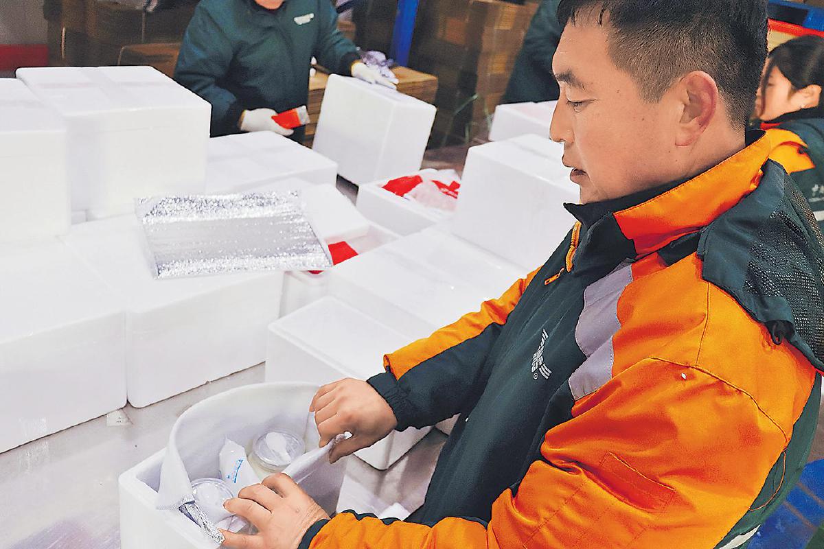 郵政工作人員在打包“極速鮮”郵件?! 醪锋骆隆z